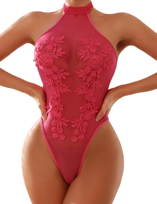 Women Teddy Lingerie Sexy Mesh Bodysuit Halter Snap Crotch Body Suits Sheer Emboroidered One Piece Babydoll